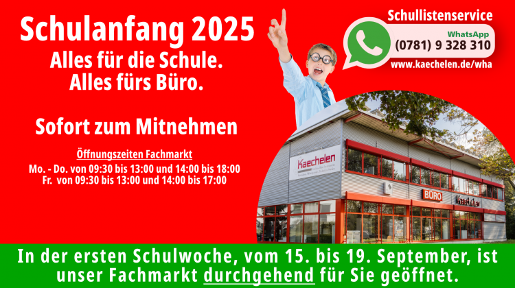 In der ersten Schulwoche vom 15. bis 19. September ist unser Fachmarkt durchgehend für Sie geöffnet.