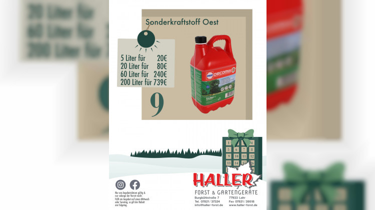 Oest Sonderkraftstoff für Motorsägen und Geräte. Sauber, lagerstabil und zuverlässig. Heute bekommst du 5 Liter für 20 Euro, 20 Liter für 80 Euro, 60 Liter für 240 Euro und 200 Liter für 739 Euro bei Haller Forst und Gartengeräte. Solange verfügbar.