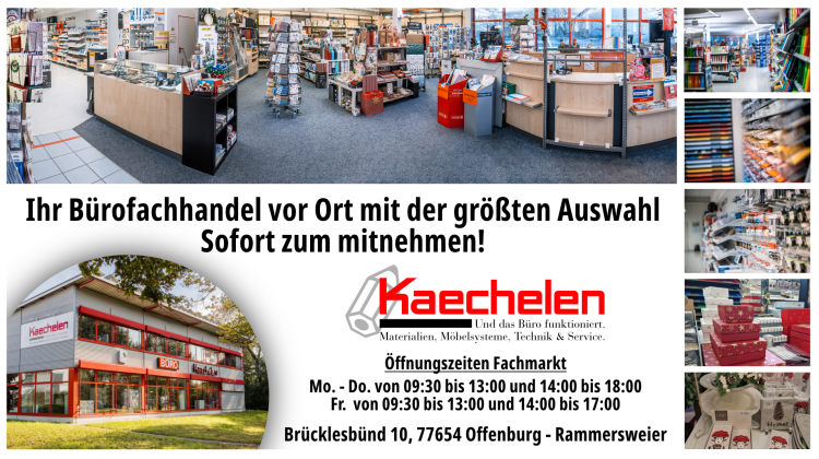 Willkommen bei Kaechelen in Offenburg! Seit 1893 kümmert sich unser Team mit rund 30 Mitarbeitern darum, dass Ihr Büro funktioniert. Wir bieten Ihnen alles für den täglichen Bürobedarf. Von Büromaterial über Werbegeschenke für Kunden und Mitarbeiter bis hin zur neuen Büroeinrichtung. Ebenso können Sie mit uns Ihre Dokumente im täglichen Betrieb digitalisieren, drucken, scannen und archivieren. Mit unserer digitalen Konferenztechnik können Sie mit Ihren Kunden in digitalen Kontakt treten. Fordern Sie uns, wir sind gerne für Sie da! Unsere 5 Säulen Bürobedarf Büromaschinen Büromöbel Werbemittel Technik & Service Unsere Linktipps Onlineservices Onlineshop Bürobedarf Onlineshop Firmenbedarf Stempelshop Onlineshop Büroeinrichtung Werbemittel Ortenau Öffnungszeiten Fachmarkt Montag 09:30 bis 13:00 und 14:00 bis 18:00 Uhr Dienstag 09:30 bis 13:00 und 14:00 bis 18:00 Uhr Mittwoch 09:30 bis 13:00 und 14:00 bis 18:00 Uhr Donnerstag 09:30 bis 13:00 und 14:00 bis 18:00 Uhr Freitag 09:30 bis 13:00 und 14:00 bis 17:00 Uhr